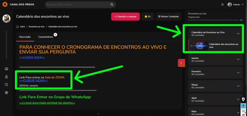 O Link e a Senha estão publicados na ÁREA DE MEMBROS do Casal dos Vídeos na primeira aula do “Módulo: ENCONTROS AO VIVO”. 🚀